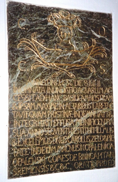 ANNO DOMINI 1736 DIE 8 JULII INOPINATA INUNDATIO AQUARUM ACCESSIT AD HANC BASILICAM MNOSTRAM ET IPSAM MAXIME IN ALTARIBUS LABEFACTAVIT, QUAM PRISTINAE INDEMNITATI ET INTEGRITATI EFFUSA MUNIFICENTIA SUA ANNO SEQUENTI RESTITUIT ILLUSTRISSIMUS ET EXCELLENTISSIMUS DOMINUS CAROLUS, ZELO ET PIETATE IN DEUM MAGNUS IN OPALENICA OPALINSKI COMES DE BNIN CAPITANEUS SREMENSIS ETC, ETC. ORATE PRO EO - 8 lipca roku pańskiego 1763 niespodziewana powódź sięgnęła do tego oto naszego kościoła uszkadzając zwłaszcza ołtarz. Tę to świątynię w następnym roku do dawnego bezpieczeństwa i pierwotnego stanu, dzięki obfitej szczodrobliwości swojej, przywrócił Jaśnie Oświecony i Najzacniejszy Pan, wielki zapałem i miłością ku Bogu, Karol Opaliński Książe Bniński i Starosta Śremski etc., etc. Módlcie się za nim