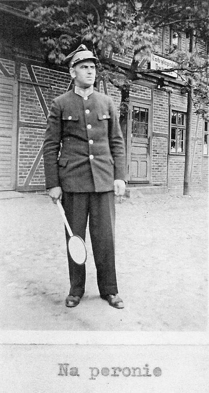 Zawiadowca p. Makowski przed budynkiem stacji