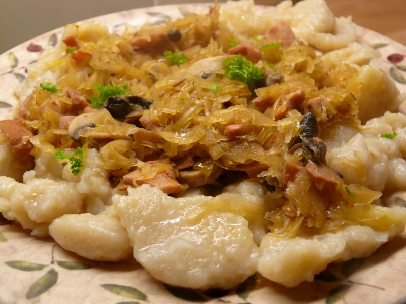 Szare kluchy - kluski z ziemniaków podawane ze skwarkami z boczku lub wędzonki z ugotowaną kiszoną kapustą.