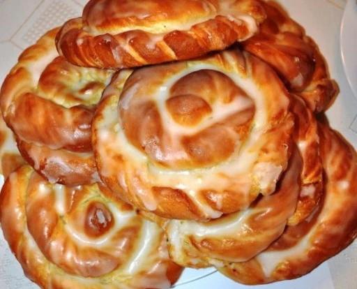 Z ciepłego mleka i drożdży przygotowujemy rozczyn, odstawiamy w ciepłe miejsce. Masło topimy w rondelku i odstawiamy do ostudzenia. Jaja ucieramy z cukrem, cukrem waniliowym i szczyptą soli, dolewamy wyrośnięte drożdże, dosypujemy mąkę i bardzo dokładnie wyrabiamy ciasto. Dodajemy przestudzone masło i dalej wyrabiamy, aż ciasto będzie odchodziło od ręki. Z ciasta formujemy bułeczki, układamy na blasze wyłożonej papierem do pieczenia, przykrywamy ściereczką i zostawiamy w ciepłym miejscu do wyrośnięcia. następnie smarujemy po wierzchu mlekiem ,wstawiamy do piekarnika nagrzanego do 180 st i pieczemy na złoty kolor ok 30-35 min. Jeszcze ciepłe smarujemy lukrem.